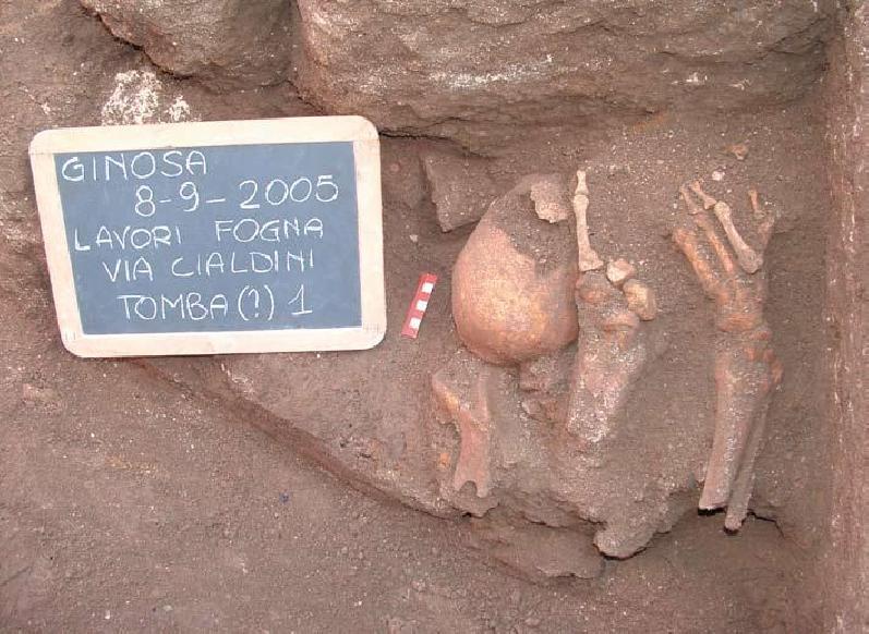 Nel settembre 2005 mentre effettuavo gli ordinari controlli sul cantiere d’impianto della nuova rete fognaria (Via Cialdini), rinvenivo, 80 cm al di sotto del piano stradale (strato di asfalto e relativo massetto) ed all’interno di una trincea lunga ca. 6 m., la presenza di depositi archeologici e di sepolture già gravemente danneggiate dal lavoro della ruspa. Sotto la direzione della dott.sa Schojer (Soprintendenza Archeologica per la Puglia) è stato eseguito un intervento di scavo della durata di 5 giorni. Sono state rinvenute, lungo un medesimo allineamento, 4 sepolture di datazione incerta. Tuttavia le tombe n. 3 e n. 4 sembrano riferibili ad età medioevale: la 3 è un ossario con all’interno resti riferibili ad almeno tre inumati (vista la presenza di altrettanti calvari), mentre la 4 presenta l’inumato in posizione tipicamente medioevale, ovvero in decubito orizzontale con le braccia incrociate sul torace. Le sepolture n. 1 e n. 2, invece, sono forse riconducibili ad ambito indigeno (età peuceta). Entrambe sono di piccole dimensioni (tipo quelle rinvenute in località Lama, cfr. scheda N. 17) e presentano un lato già asportato dalla ruspa. Estremamente interessate la tomba 1. Qui l’inumato, un individuo adulto, è in giacitura primaria ma risulta tagliato in almeno quattro parti deposte in sovrapposizione: nell’ordine (dall’alto verso il basso) erano deposti gli arti inferiori, il torace con il calvario e gli arti superiori. La tomba 2 presentava invece l’inumato in posizione rannicchiata. Al di sotto del piano delle sepolture, invece, si rinviene un’interessante stratigrafia probabilmente riferibile a livelli abitativi protostorici (età del Ferro) vista la presenza di strati di focolare associati a numerosi frammenti ceramici cronologicamente inquadrabili nel protogeometrico japigio. |