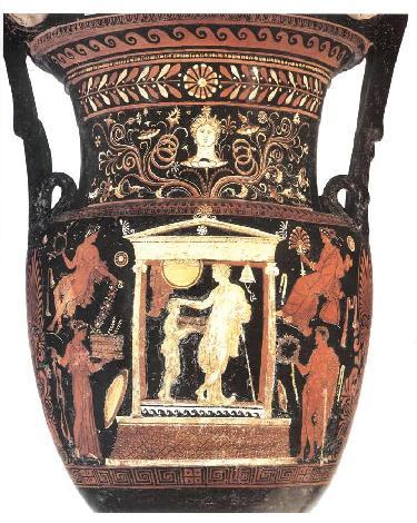 Il primo cratere descritto fu pubblicato per la prima volta da Scarfì (Due pittori apuli della seconda metà del secolo IV a.C., in “Archeologia Classica”, 11, 1959, p. 181) che lo attribuì alla mano di un ceramografo apulo indicato come Pittore A del gruppo degli Heroa. Invece Trendall (The red-figured vases of Apulia, I-III, Oxford 1982, p. 463) attribuisce il manufatto al pittore di Copenhagen 4223, attivo nella seconda metà del IV sec. a.C. |