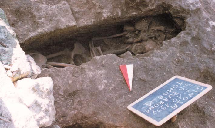 «Nel corso dell’operazione “Puliamo il mondo” eseguita alla fine di settembre dai volontari di Legambiente – Circolo “Giano” di Ginosa all’interno dell’insediamento rupestre, sono venute alla luce due tombe in via Burrone, una strada che conduce al fondo della gravina. L’intervento di urgenza seguito alla segnalazione non ha potuto estendersi oltre lo spazio ristrettissimo (m 2x3) esistente tra la strada e lo spalto di affaccio sulla gravina, e le costruzioni esistenti. Si sono rinvenute complessivamente quattro sepolture di età medioevale, due con orientamento N-S e due con direzione E-O. Le tombe, a fossa scavata nel banco calcarenitico, avevano forma stretta e allungata, a “fuso” ed erano tutte prive di copertura. Nella tomba 1, l’unica bisoma, la deposizione più recente era in perfetta connessione anatomica, i resti dell’altra erano invece accantonati alla rinfusa presso le due testate. Della tomba 4 è stato possibile mettere in luce la sola testata S, con un cranio, poiché tutto il resto ricadeva sotto il muretto di recinzione nella strada stessa. Le sepolture occupavano lo spazio antistante una piccola chiesa rupestre, trasformata in abitazione, nella quale si conservano ancora labili tracce degli affreschi originari. È imprecisabile la collocazione cronologica di questo nucleo di tombe nell’ambito dell’età medioevale, a causa della totale assenza di elementi di corredo; la continuità di vita nella zona fino a trent’anni orsono ha peraltro cancellato ogni possibile traccia delle presenze più antiche» |